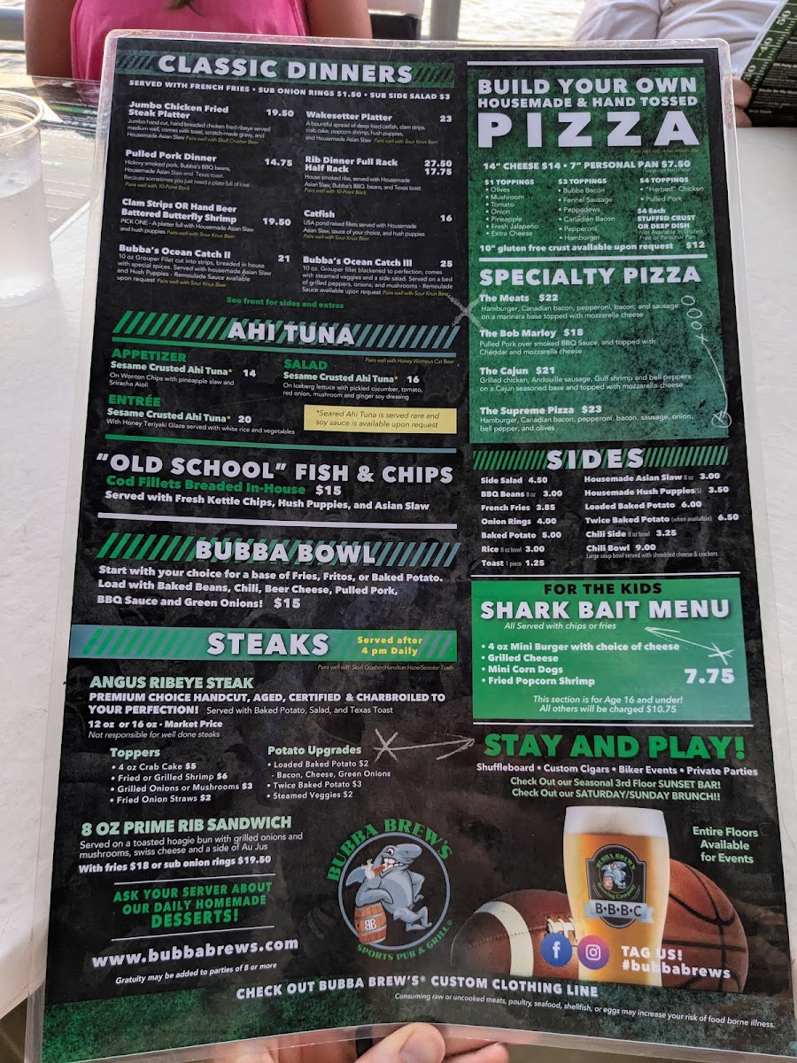 Guests often enjoy hearty favorites like the Pulled Pork Sandwich, Rib Dinner Full Rack, or Grouper Tacos, pairing well with cold craft beers such as the 10 Point Bock or seasonal Pumpkin Beer. For lighter or shared plates, items like Bubba’s Brew Nachos with pork and chicken, Jalapeño Cheddar Crab Bites, or crispy Cheese Curds fit perfectly into casual conversations and relaxed vibes.